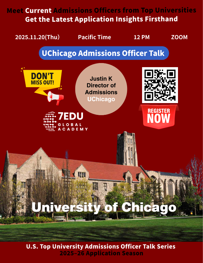 If you’re looking into the University of Chicago as part of your college list, don’t miss this unique opportunity: Inside the University of Chicago: An Exclusive Info Session with the Director of Admissions. This FREE Webinar is part of the College Info Sessions hosted by 7EDU Global Academy, where you can get inside information from respective college admissions officers directly!