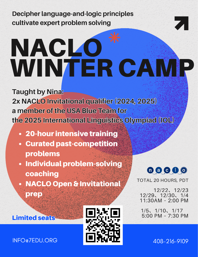 Whether you’re new to linguistics or aiming for the Invitational Round, 7EDU’s NACLO Winter Camp is your chance to learn from the best and prepare with purpose. With expert coaching, proven results, and a supportive learning community, you’ll gain the tools and confidence to tackle any challenge that comes your way. Join us this winter and take the first step toward becoming the next NACLO success story.
